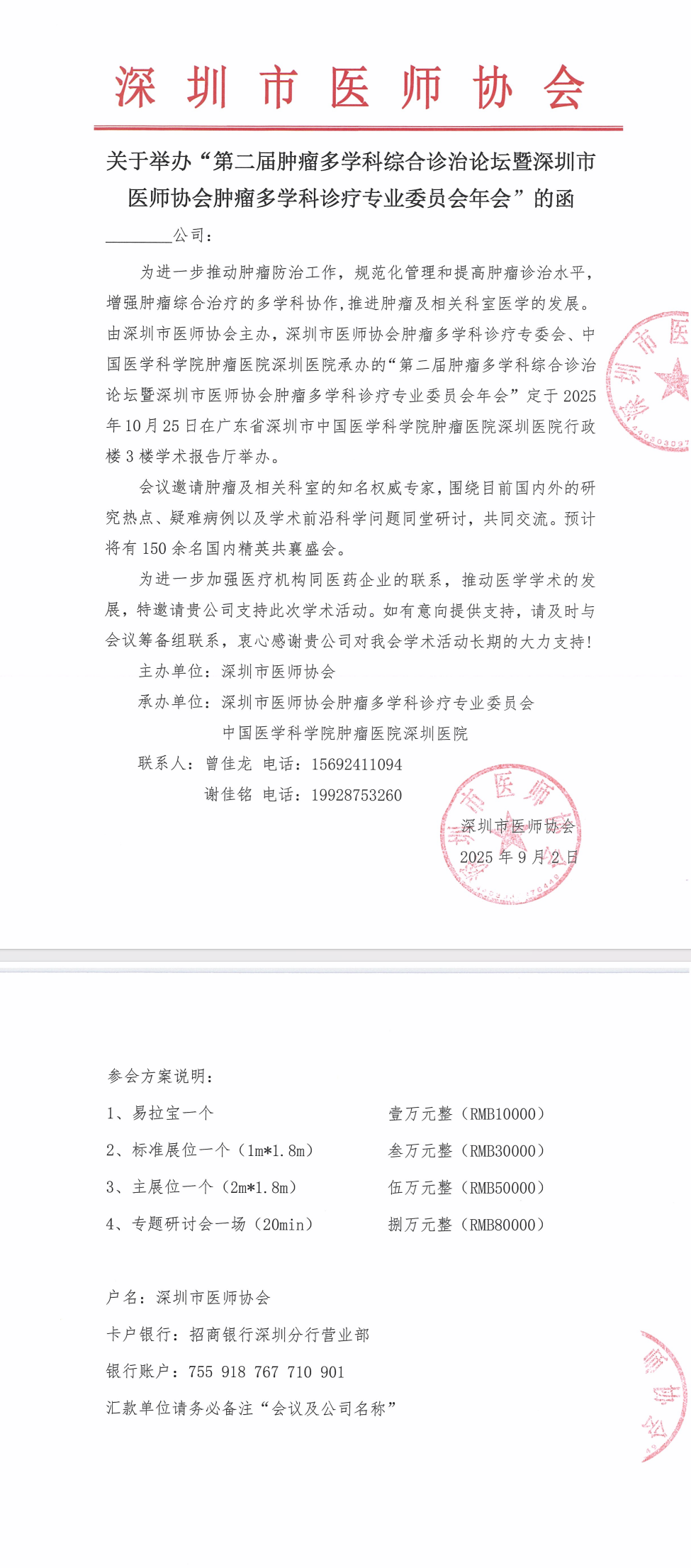 关于举办“第二届肿瘤多学科综合诊治论坛暨深圳市医师协会肿瘤多学科诊疗专业委员会年会”的函